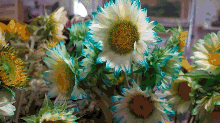 The sunflower (Helianthus annuus) is an annual plant with a sizeable daisy-like flower face. Its scientific name comes from the Greek words helios (“sun”) and anthos (“flower”). The flowers come in many colors (yellow, blue,purple,black,white,green,pink,red, orange, maroon, brown), but they are commonly bright yellow with brown centers that ripen into heavy heads filled with seeds.  Sunflowers make excellent cut flowers, and many attract bees, birds, and butterflies.