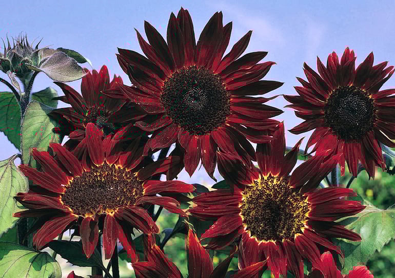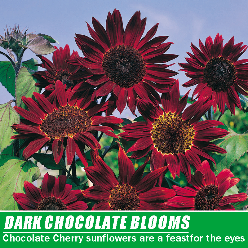 Chocolate Cherry Sunflowers reach up to 6–7 feet tall, crowned with velvety burgundy-black petals and rich, dark centers that turn heads and attract pollinators alike.