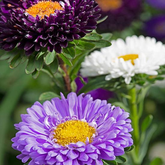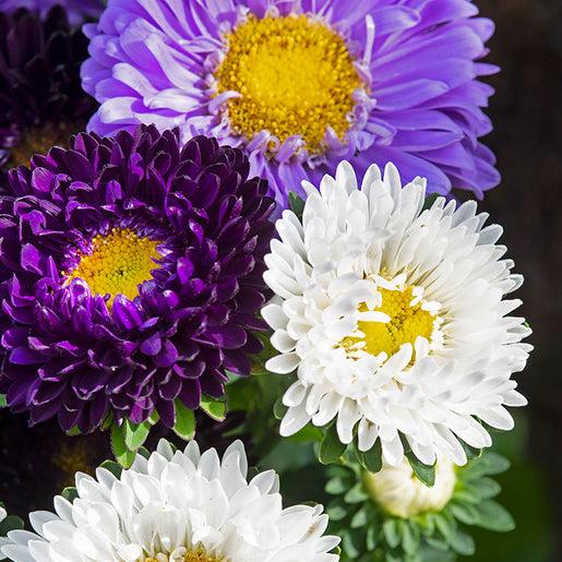 Callistephus chinensis. The Blues Mix is an excellent choice for the cut flower garden. It blooms from July to October on strong, upright, multi branching stems to a height of 75cm (30"). The mix of large and small flowers appear in blues, purples, and white, but all with the ruff of fully double petals. All are attractive to pollinating insects and hummingbirds, and they look magnificent in a large bouquet. Be sure to take frequent harvests of cut flowers, or at least keep the plants dead-headed to prolong and enhance the bloom time. Please follow the planting and spacing instructions closely.
